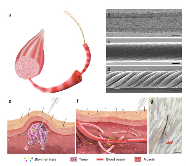 復旦大學高分子科學系教授彭慧勝、副教授孫雪梅,生命科學學院教授俞洪波,航空航天系教授徐凡等多學科團隊獨辟蹊徑,通過仿生肌肉結構的方法,設計了具有多級螺旋結構的纖維狀電化學傳感器。納米壓痕和力學模擬實驗證明,碳納米管纖維相對傳統(tǒng)的植入材料(金絲、聚二甲基硅氧烷等)其抗彎剛度相對于其他傳統(tǒng)植入材料更接近柔軟的組織,且具有更低的彎曲內(nèi)應力。同時,團隊利用與纖維一維結構相適應的注射方法,將纖維狀傳感器準確植入至目標區(qū)域,纖維在體外的形態(tài)類似于動物毛發(fā)貼附在皮膚表面。管道泵