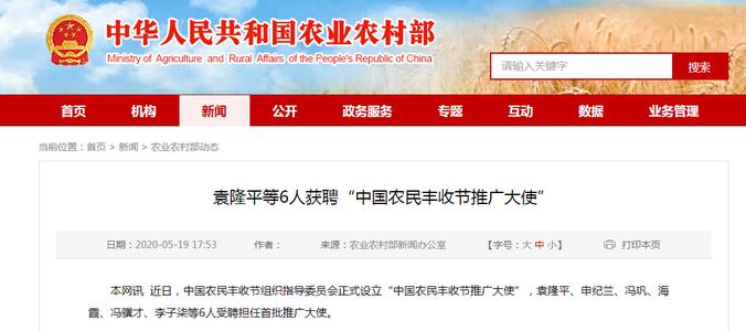 “中國農民豐收節(jié)宣傳大使”,袁隆平、申紀蘭、馮鞏、海霞、馮驥才、李子柒等被聘為首批推廣大使。