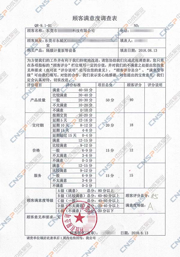 中成泵業(yè)從我們的多級泵、計量泵等產(chǎn)品的客戶中抽選幾名進行表格內(nèi)容調(diào)查,客戶反饋成績均為A級,其中螺桿泵、磁力泵、隔膜泵等客戶紛紛表示希望保持合作并對我們的產(chǎn)品持有期望。